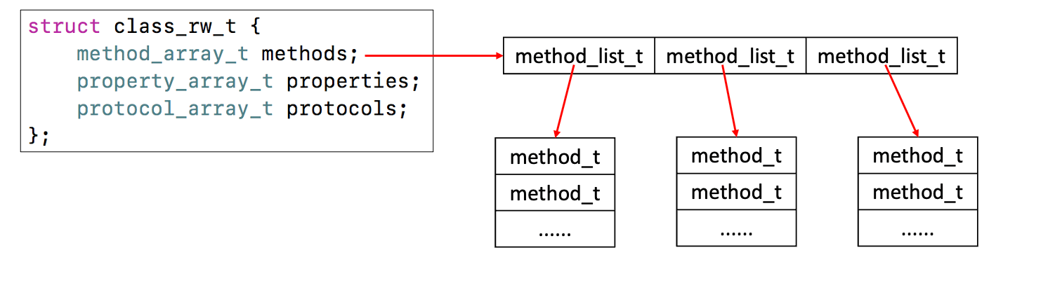 class_rw_t里面的methods、properties、protocols是二维数组,是可读可写的,包含了类的初始内容、分类的内容