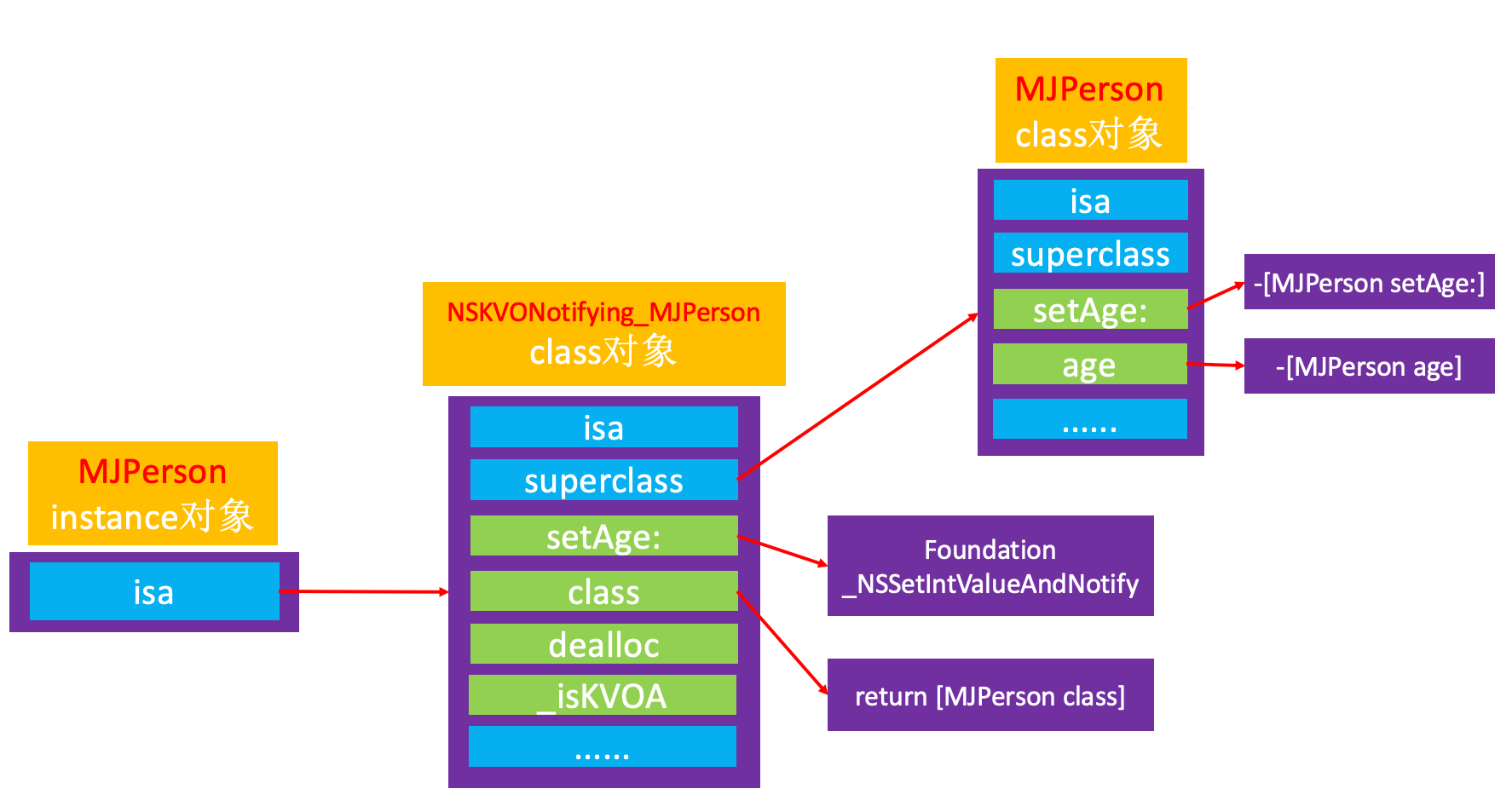 NSKVONotifying_xxxset和class方法; NSKVONotifying_xxx的set方法IMP指向Foundation框架_NSSetxxxValueAndNotify的实现;_NSSetxxxValueAndNotify的内部实现为:1