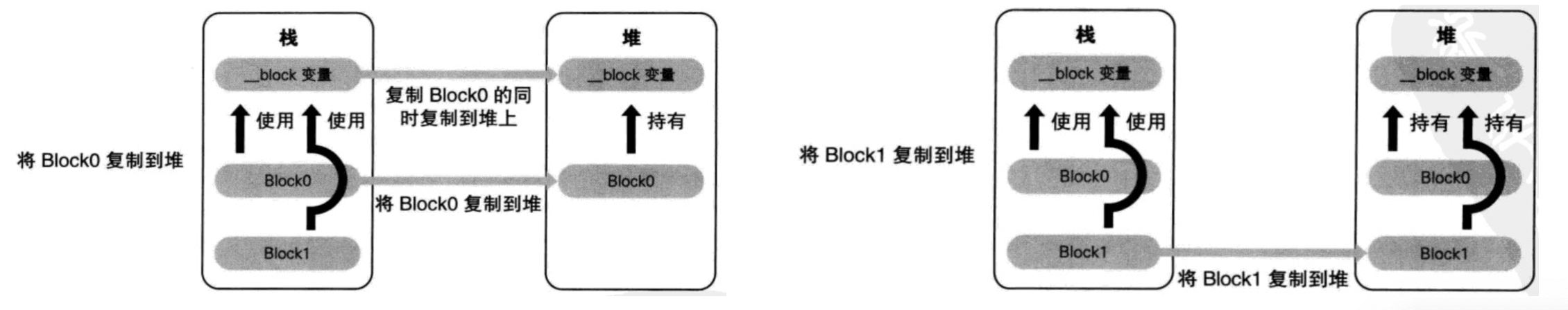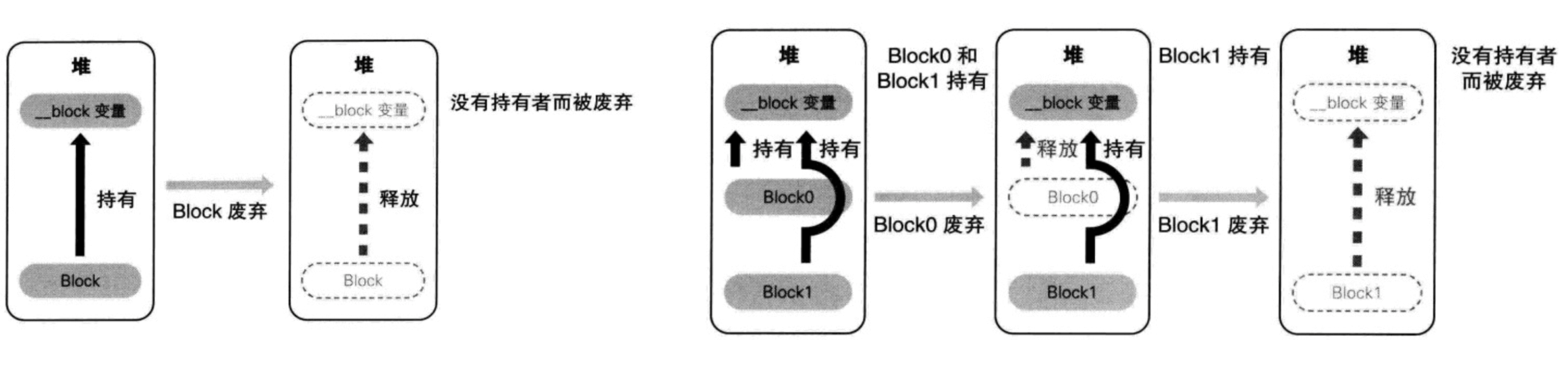 堆时,会对__block变量形成强引用(retain)会调用block内部的
