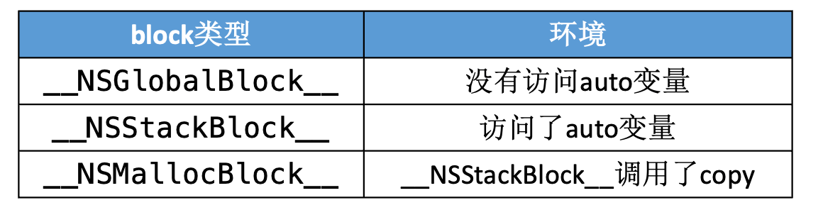block赋值给__strong指针时 block作为Cocoa API中方法名含有usingBlock的方法参数时block作为GCD API的方法参数时