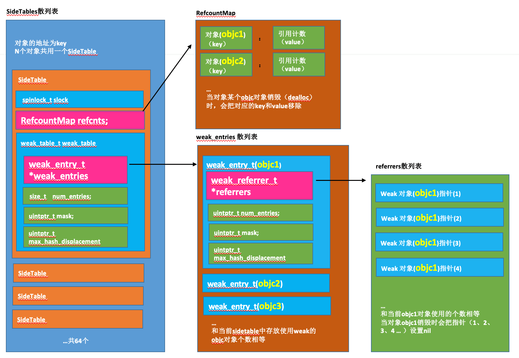 - sidetable主要管理weak指针和辅助引用计数,原理图